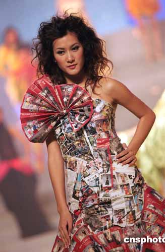“青春中華”首屆中國青年服裝時尚周十月十七日晚在寧波開幕,模特與演員共舞霓裳羽衣,展示青春韻律。圖為模特展示青年設計師用報紙、筷子等材料制作的時裝。作者:毛建軍