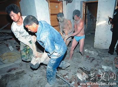 報(bào)道稱,工棚內(nèi)住有民工23人,早已熄燈睡覺(jué)。巨響之后,工棚內(nèi)立即傳出呼救聲。未被砸中的工人渾身是灰逃出來(lái)后,又折轉(zhuǎn)身去救人。因工棚配電箱被砸,他們摸黑搜索,搬開(kāi)瓦礫救人,先后用雙手刨出5名工友。