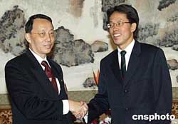 十月二十一日,國務院港澳辦副主任張曉明(右)在北京國賓館會見了由陳景生率領(lǐng)的香港大律師工會訪華團。作者:史利