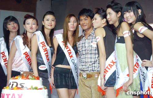 歌影紅星古天樂10月21日在香港出席PENTAX 2004 賓得數碼相機發布會,是日適逢古天樂生辰,七位賓得數碼女郎向古天樂吻賀。作者:鄧慶樂