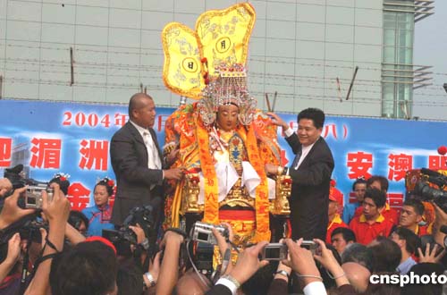 二十一日下午三時,湄洲媽祖金身乘搭專機從福州飛抵澳門,澳門中華媽祖基金會在澳門國際機場舉行隆重的接駕儀式,澳門中華媽祖基金會副主席陳明金等為媽祖金身披上金披鳳。