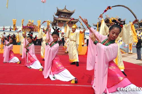 第二屆澳門媽祖文化旅游節,二十二日在澳門天后宮隆重揭幕,并舉行了氣勢恢宏的媽祖祭祀大典,在“平安曲 ”中藝員起舞頌媽祖 。作者:梁永強