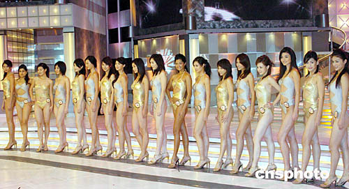 2004亞洲小姐競選總決賽十月二十四日晚在香港演藝學(xué)院舉行,來自各國的十八位參賽佳麗爭奪是次大賽桂冠。圖為參賽佳麗身穿泳裝展示風(fēng)采。中新社記者:錢興強(qiáng)