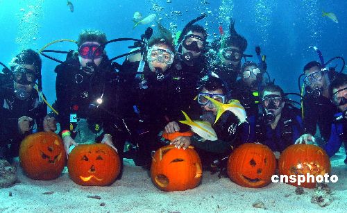 10月25日,在美國(guó)佛羅里達(dá)州25英尺海底上演了一場(chǎng)別開生面的南瓜雕刻大賽,以此迎接即將到來的萬(wàn)圣節(jié)。Ic/cnsphoto