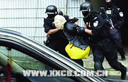 “我要裝滿油的汽車,把我送到安全地點!”“歹徒”用槍抵住“人質”的頭,跑上三樓,從窗戶內探出身子大叫:“不然我殺了他!”追捕小組一邊穩定其情緒,一邊針對現場情況制定了強攻方案。3名特警從5樓貼墻緩緩而下,此時“歹徒”叫囂就要對“人質”下手,中間的特警看準時機,開槍擊斃了一名還在叫囂的“歹徒”。兩旁的特警乘機跳入房間,將另一名“歹徒”控制住。戰斗結束,“歹徒”一死一捕,“人質”被安全救出。