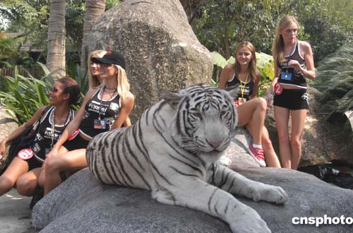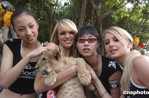 二零零四星際世界模特大賽全球總決賽入圍的五十多名選手,十一月二日首次亮相廣州長隆夜間動物世界進行形體展示和外景拍攝。作者:劉衛勇