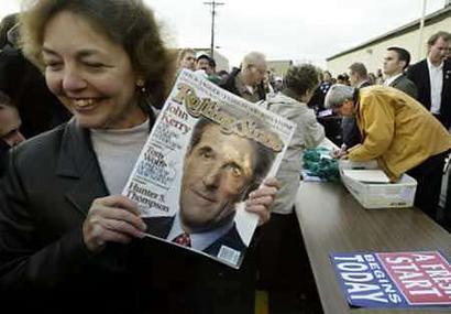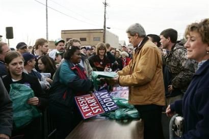 圖為2日當天克里在威斯康星州分發競選宣傳材料的一個場景,克里的一名女支持者手里拿著的雜志,是民主黨總統候選人克里簽過名了的一本競選宣傳資料。(固山)