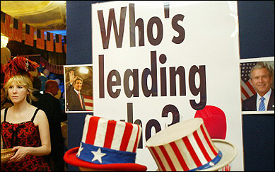 中新網11月3日電,據法新社報道 在英國倫敦達斯茅斯的一個大學宿舍里,正在舉行一個美國大選夜晚會。晚會上有一塊宣傳板,上面印有布什和克里兩位候選人的照片,還有一句口號:“誰領導誰?”(固山)