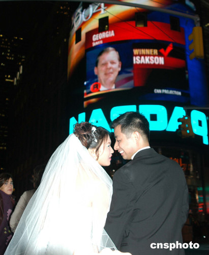 十一月二日美國大選日,一對華裔新人特意安排這一天在紐約結婚。晚上,新婚夫婦身著禮服,來到紐約時代廣場,一邊觀看大選結果揭曉的現場直播,一邊請人拍攝結婚紀念照。作者:龔文謨