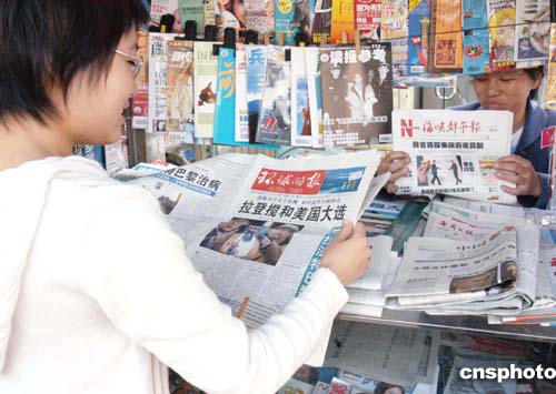 十一月三日是美國二00四年大選投票日,福州一名在校女大學生在市區(qū)街頭報攤閱讀國內(nèi)多家報刊有關(guān)新聞,關(guān)注美國選情。作者:劉可耕