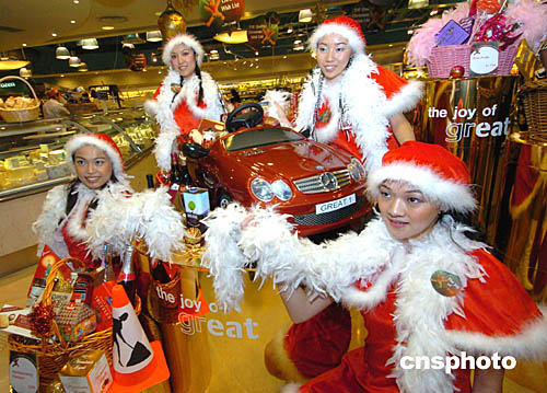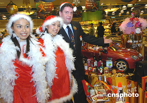 香港一家外國(guó)公司11月4日在香港太古廣場(chǎng)由圣誕俏女郎陪伴推出價(jià)值8﹐888元的圣誕跑車禮物籃。