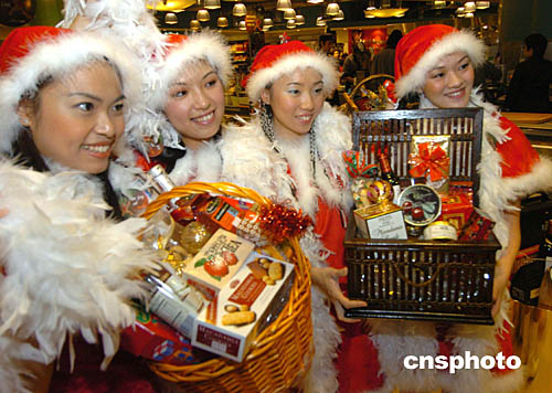 香港一家外國(guó)公司11月4日在香港太古廣場(chǎng)由圣誕俏女郎率先推出圣誕禮物籃﹐以吸引消費(fèi)者。作者:趙振清