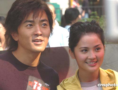 為配合電視劇《阿孖有難》的播出﹐在劇中擔(dān)任主要角色的鄭伊健和蔡卓妍6日在香港尖沙咀街頭造勢。作者:趙振清