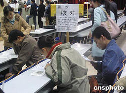 2005年全國碩士研究生招生首次在全國范圍內試行網上報名,考生須于11月10日至14日到省級招生辦指定的報考點確認報名信息才能有效。圖為報考中國人民大學碩士研究生的學生11月10日在現場仔細核對自己的報名信息。作者:張碩