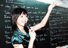 “孫老師”教學果然魅力十足,逐句逐字解釋,還加輕哼吟唱,孫老師點名學生上臺唱一遍,還大玩英文押韻游戲,臺上、臺下的互動自然深刻,她笑說:“我在新加坡念行銷時,數學和各科都是以英文學習,所以教英文對我來說不難,希望大家未來的英文愈來愈好,能真正體驗每首歌詞的美妙意境!”