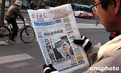 十一月十一日下午四時許,眾多北京市民默默在街邊報亭購買北京首家登載阿拉法特去世消息的《北京晚報》,詳細(xì)觀看有關(guān)新聞。中新社記者:鄒憲