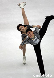 中國雙人滑選手張丹、張昊在短節目比賽中,精彩地演繹了美國布魯斯樂曲伴奏的短節目All Alone,奪得第二名。