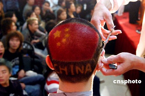 一位美發師在為參賽選手精心修剪,涵蓋了中國國旗圖案、“CHINA”和“2008”字母在參賽選手頭上。