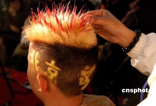 一位美發師在為參賽選手整理發型,“北京”、“中國印”和“2008”字樣在參賽選手頭上得到完美展。