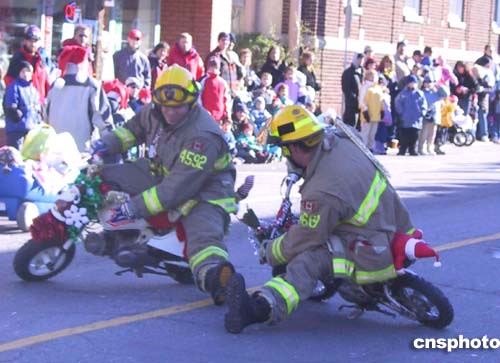 加拿大民意測驗(yàn)中最受百姓喜歡的消防員腳踏迷你小摩托,當(dāng)街表演。作者:蒲力