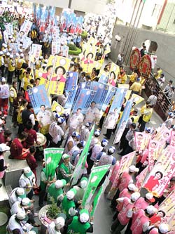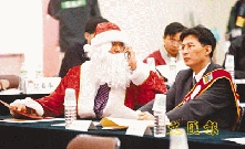53位臺北縣“立委”參選人17日上午齊聚體育場進行號次抽簽,為了搶鏡頭,各出奇招,有人扮成媽祖、還有人扮成了包青天、圣誕老人。支持者在現場揮舞旗幟、高舉活動招牌,大喊“當選”。