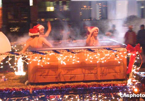 幾位少女頭戴圣誕帽、身著比基尼浸在熱水中以奇特方式向人們祝賀圣誕,令人“瞠目結舌”。