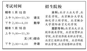 2005年春季高考將于明年1月15日、16日舉行。面向北京招生1542人,比去年增長42人。其中本科招生300人,高職專科招生1242人。
