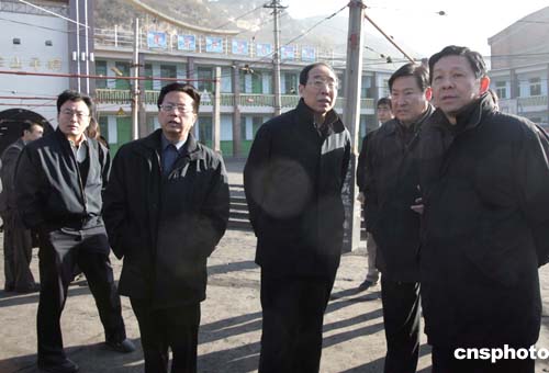 國務院副秘書長尤權(右三)、陜西省代省長陳德銘(右四)等29日上午到礦務局醫院慰問脫險礦工。作者:任晨鳴