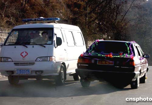 | 圖:救護(hù)車婚車背道而馳 銅川陳家山亦憂亦喜