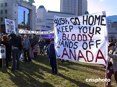 | 當(dāng)?shù)貢r(shí)間十一月三十日,抵達(dá)渥太華開始對(duì)加拿大進(jìn)行訪問的美國(guó)總統(tǒng)布什遭遇大規(guī)模抗議示威。示威者舉著“布什回家去,讓你沾滿鮮血的雙手遠(yuǎn)離加拿大”的橫幅,抗議布什的戰(zhàn)爭(zhēng)政策。作者:蒲力