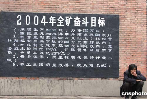 12月1日傍晚,陜西銅川礦務(wù)局陳家山煤礦被困井下礦工全部確認(rèn)遇難后,一名工人無(wú)奈地蹲在礦區(qū)的“2004年全礦奮斗目標(biāo)”宣傳牌前。有不少人認(rèn)為,此次礦難的部分原因是礦方一味追求產(chǎn)量忽視安全造成的。作者:任晨鳴