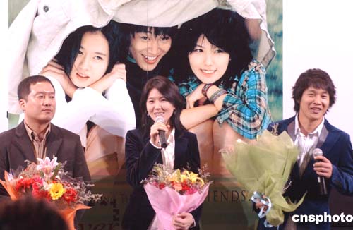十二月三日,二零零四北京韓國電影展在北京新世紀影院舉行首映式,韓國導演姜帝圭、金基德、金容華、李翰,演員車太賢、李恩宙、張伸瑛等明星集體亮相。圖為韓國導演李翰(左一)、李恩宙(中)車太賢(右一)在觀眾見面會上為《向左走向右愛》造勢。作者:韓藝冰