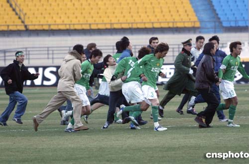 在比賽結束后,不少球迷跳下看臺沖上球場爭搶北京現代隊隊員的隊服。作者:盛佳鵬