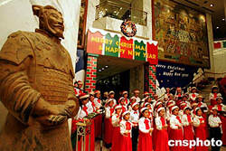 一名威武的“秦代兵馬俑”微笑著聆聽西安市兒童圣誕唱詩班的優美歌聲。12月4日的周末夜晚,西安市喜來登大酒店舉行迎接圣誕節亮燈儀式。與此同時,這座古老城市的圣誕氣氛越來越濃。中新社記者:任晨鳴