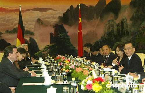 十二月六日,中國國務院總理溫家寶在北京人民大會堂與來訪的德國總理施羅德舉行會談。中新社記者:史利