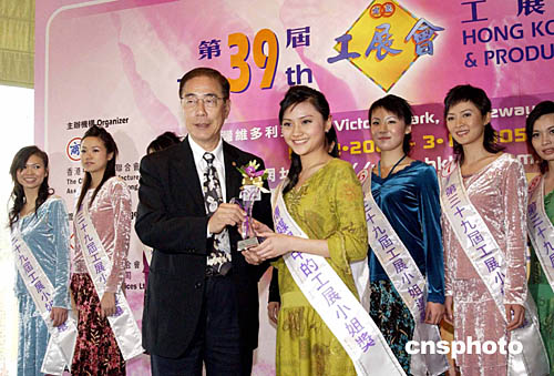 廠商聯合會會長楊孫西向率先出爐的“傳媒眼中的工展小姐”麥鍶銘頒獎。
