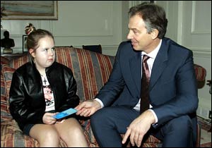 中新網12月8日電 英國《太陽報》報道,7日,英國首相布萊爾會見了12歲小姑娘比安卡·鮑威爾,對她與壞人進行頑強抗爭的精神給予了充分肯定。