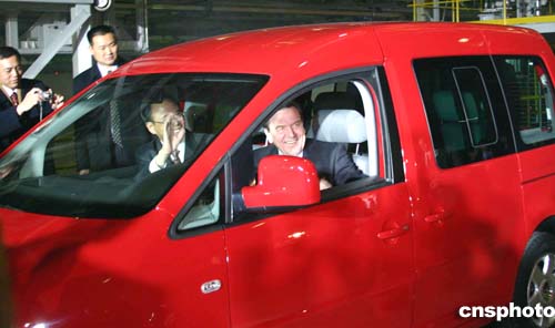圖為施羅德與曾培炎在剪彩后試乘該廠生產線上的新車。作者:吳兆飛