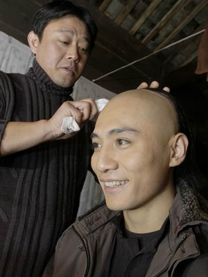答:那是戴頭套的。這個(gè)戲是我第一次剃頭,因?yàn)橐成祥L(zhǎng)辮子,不然就粘不穩(wěn)。