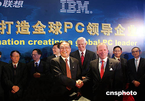 圖為聯(lián)想集團(tuán)董事局主席柳傳志(前左)、IBM高級(jí)副總裁Mr.John.Joyce(前右)在簽約現(xiàn)場(chǎng)。