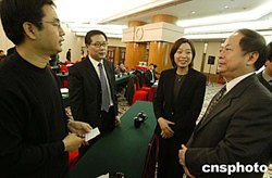 連續(xù)兩日舉辦的商務(wù)部首期服務(wù)外包培訓(xùn)班學(xué)術(shù)交流氣氛濃厚,許多成員借此機(jī)會(huì)向?qū)<覍W(xué)者請教咨詢。十二月十日,富士施樂(中國)有限公司副總裁李濟(jì)華(右)、北京博思商通資訊有限公司董事長曾松(左二)與商務(wù)部有關(guān)人員一起交流。中新社記者:任海霞