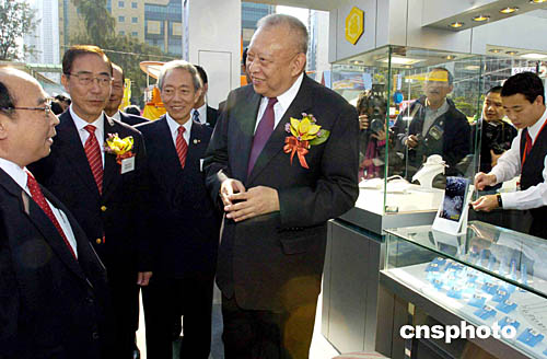 香港特區(qū)行政長官董建華,12月11日在維園主持“第三十九屆工展會”開幕典禮,隨后興致勃勃的參觀會場。圖為董建華在中華廠商聯(lián)合會長楊孫西等陪同下了解珠寶業(yè)在內(nèi)地發(fā)展業(yè)務(wù)的情況。