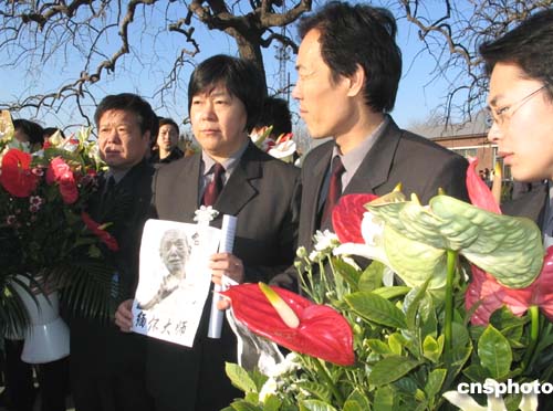 國際數學大師陳省身遺體告別儀式十二月十二日上午在天津北倉殯儀館舉行。海內外人士手捧大師遺像和他生前喜愛的紅掌花,依依送別陳省身先生。作者:柳俊武