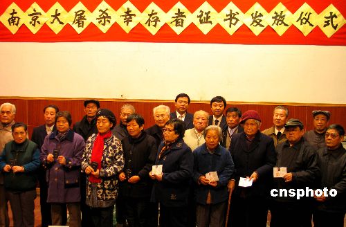 昨天,侵華日軍南京大屠殺幸存者援助協(xié)會向21位幸存者代表頒發(fā)了首批證書。首批獲得證書的共有179位幸存者。這本證書是對幸存者的身份和受害經(jīng)歷等自然狀況進(jìn)行了完整核實后統(tǒng)一制作的。幸存者們憑借該證可以享受政府和社會各界給予的援助和優(yōu)惠政策,并且可以憑證免費參觀市內(nèi)七個文化場館、景點。
