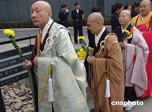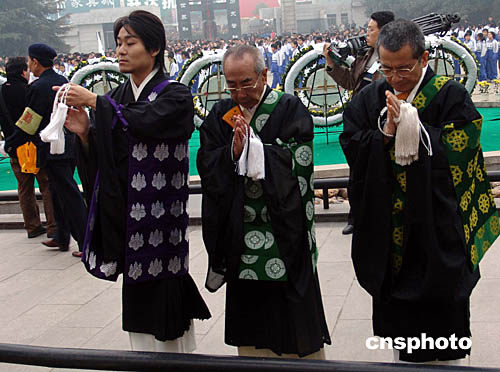 日本東鐵路工會、日本佛教徒和平訪問團等日本和平友好人士參加了今天的悼念活動。并在會場上打出了“我們決不忘記南京大屠殺的事實”、“反對日本向海外派兵”等橫幅標語。