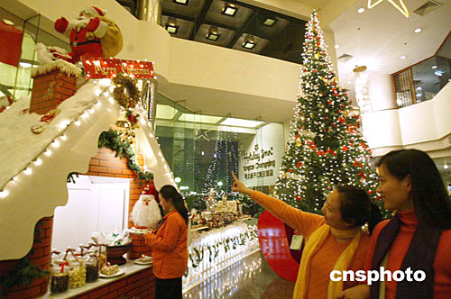 十二月十三日,幾名重慶女孩被裝飾精美的圣誕樹和冰雪小屋所吸引。圣誕臨近,重慶各大商場、酒店紛紛裝點出濃郁的圣誕氣氛。作者:郭晉嘉