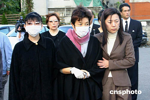 圖為靈車正將遺體送暫厝地,家屬在后護送。