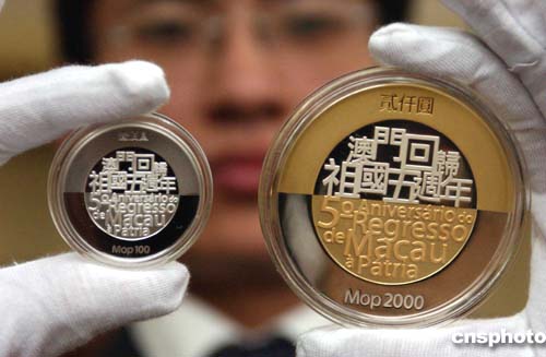 | 為紀(jì)念澳門回歸祖國(guó)五周年,由澳門金融管理局在海內(nèi)外首次發(fā)行的四種面額為2000元、1000元、200元和100元的銀質(zhì)紀(jì)念幣十二月十六日在北京民族飯店首次展出。首批紀(jì)念幣將在十二月二十日分別在北京、上海、廣州、天津、深圳、西安、太原等城市上市銷售。作者:韓藝冰