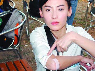 張柏芝在拍廣告時不改其貪玩的個性,與古天樂打鬧,還不慎擦傷玉臂。張柏芝很傷心地向記者展示她手臂上的傷痕說:“今天拍這個廣告主要是說我和古仔(古天樂)都是射擊好手,所以剛才在拍攝的空隙我就和他拿著手槍追逐互射,他斗不過我,就拿桌上的產(chǎn)品來擲我,我在左閃右避的時候手臂就碰到背景板,這些背景板都是用木制的,很粗糙,所以就刮傷了手,皮都掉了,當場流血。”