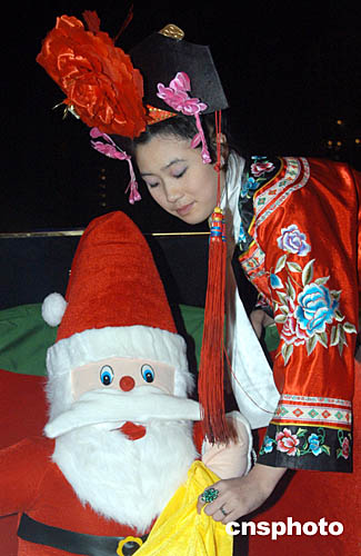圣誕節(jié)即將來臨,十二月十七日,北京一家王府式酒店里身著宮廷服裝的女孩正用“圣誕老人”布置大堂,營造圣誕氣氛。中新社記者:張宇